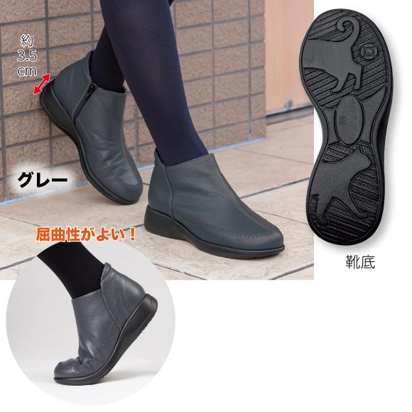 5Eと幅広ながら甲周りにアウトステッチでアクセントをつけ、おしゃれに仕上げたゆったりアンクルブーツ。足裏をしっかりサポートする中敷クッションも装備し、足に悩みのある方にも快適に履いていただけます。サイドファスナーで脱ぎ履きスムーズ。ソールは程よい高さで屈曲性もよく、軽やかな歩行を実感できそうです。